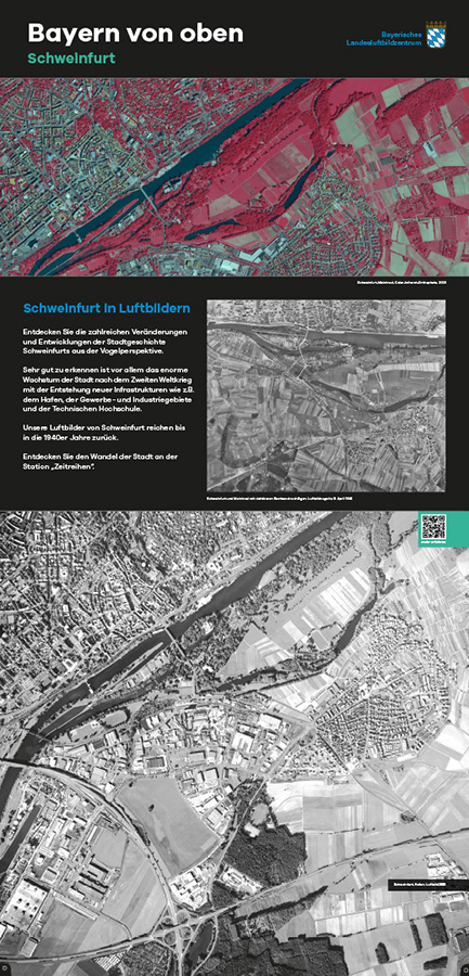 Anlässlich des fünfjährigen Bestehens des Bayerischen Landesluftbildzentrums stellte die Wanderausstellung dessen Angebote einem breiten Publikum vor. Die multimedial gestaltete und leicht verständlich aufbereitete Ausstellung vermittelt einen spannenden Einblick in die Geschichte und Technik der Luftbildfotografie. Auf 14 Ausstellungstafeln wurde den Besucherinnen und Besuchern gezeigt, wie Luftbilder gemacht werden, wie sie aufbereitet werden und wo sie eingesetzt werden.